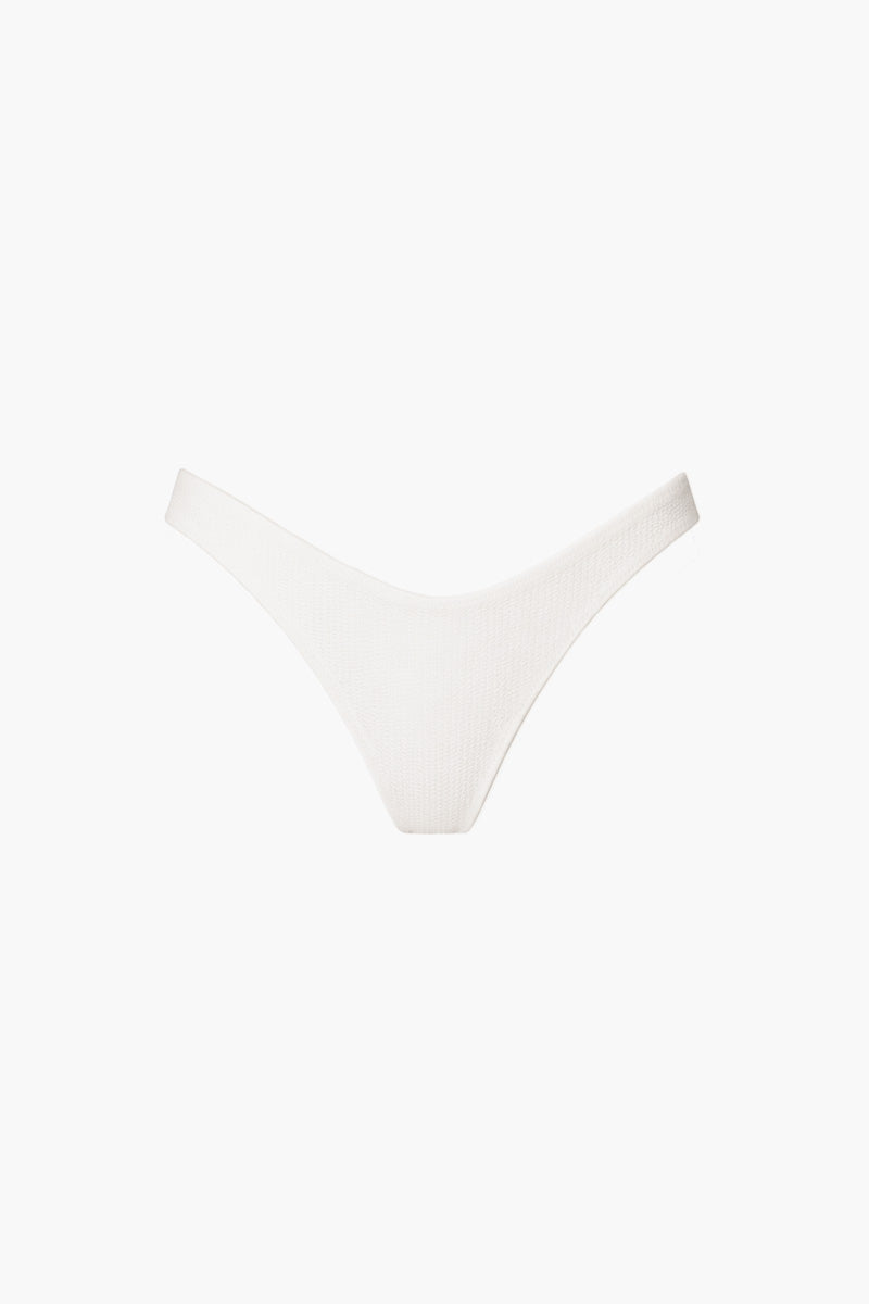 A minimal-coverage bikini bottom designed with a thong-style silhouette made in a smooth soft crinkle fabric adding a refined, elevated look.